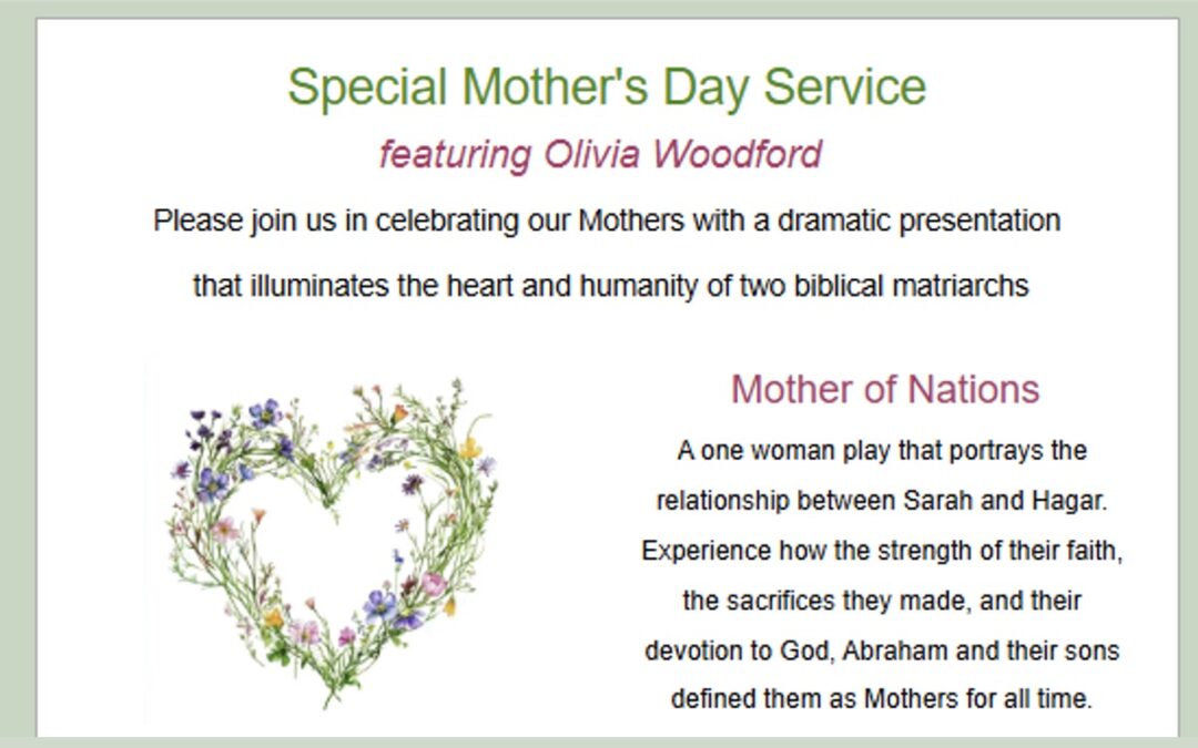 Please plan to join us at Crawford on Mother’s Day (May 10), for a special Mother’s Day service at 10am that will include a dramatic presentation by Olivia Woodford. Olivia will perform a short one-woman play that portrays the relationship between Sarah and Hagar. “Experience how the strength of their faith, the sacrifices they made, and their devotion to God, Abraham, and their sons defined them as Mothers for all time.” Click HERE to download a copy of the flyer that you can share with family and friends. If you have any questions, contact the church office (office@crawfordumc.org or 781-729-5056).